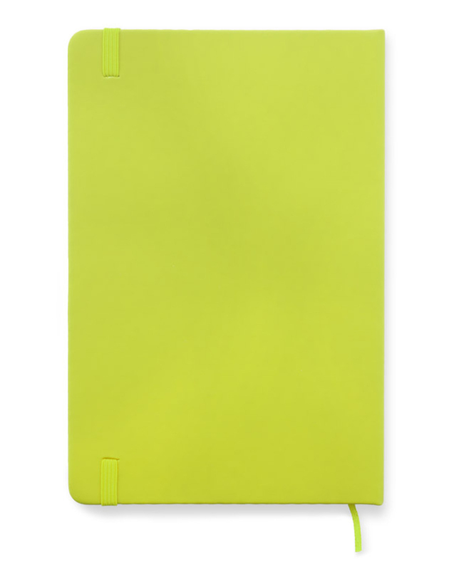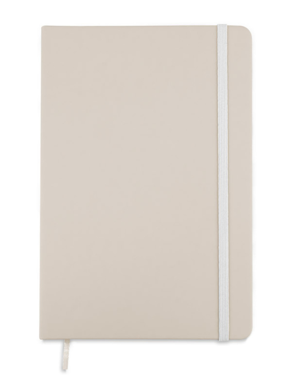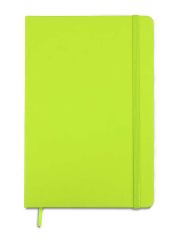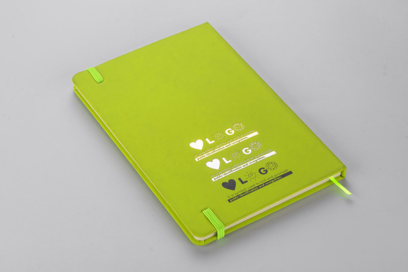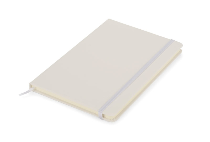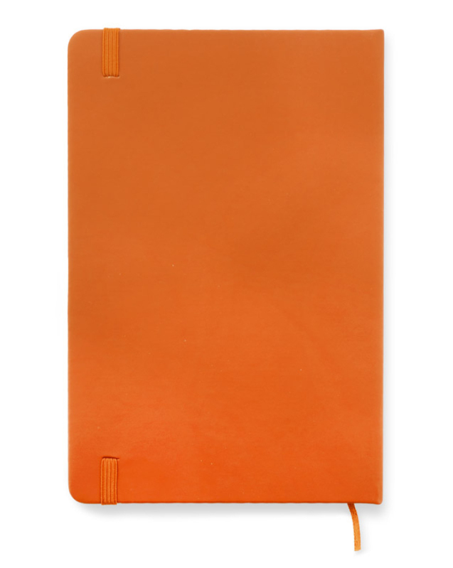 Exkluzivní notebook A5 z eko kůže s barevným gumovým uzávěrem. 80 listů podšitých. Linka oranžová barva. Logo je vytištěno na obálce a listy jsou barvy ecru.