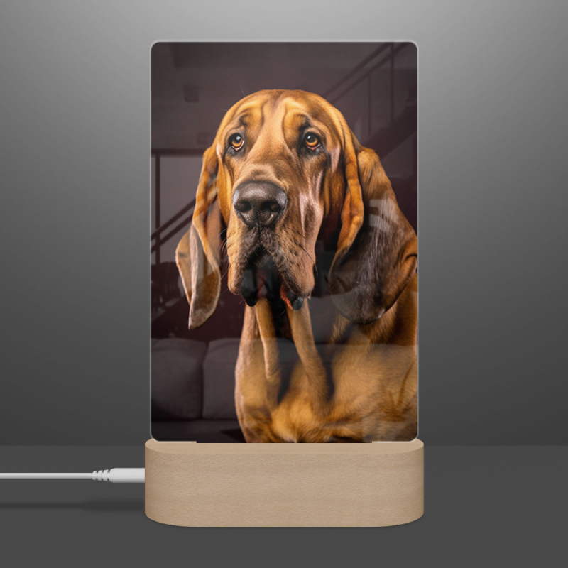 Součástí balení je akrylové sklo dle výběru, dřevěný RGB LED stojánek a napájecí USB kabel.
