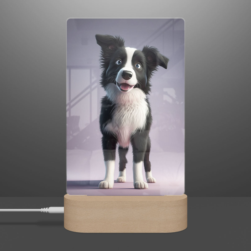 Součástí balení je akrylové sklo dle výběru, dřevěný RGB LED stojánek a napájecí USB kabel.
