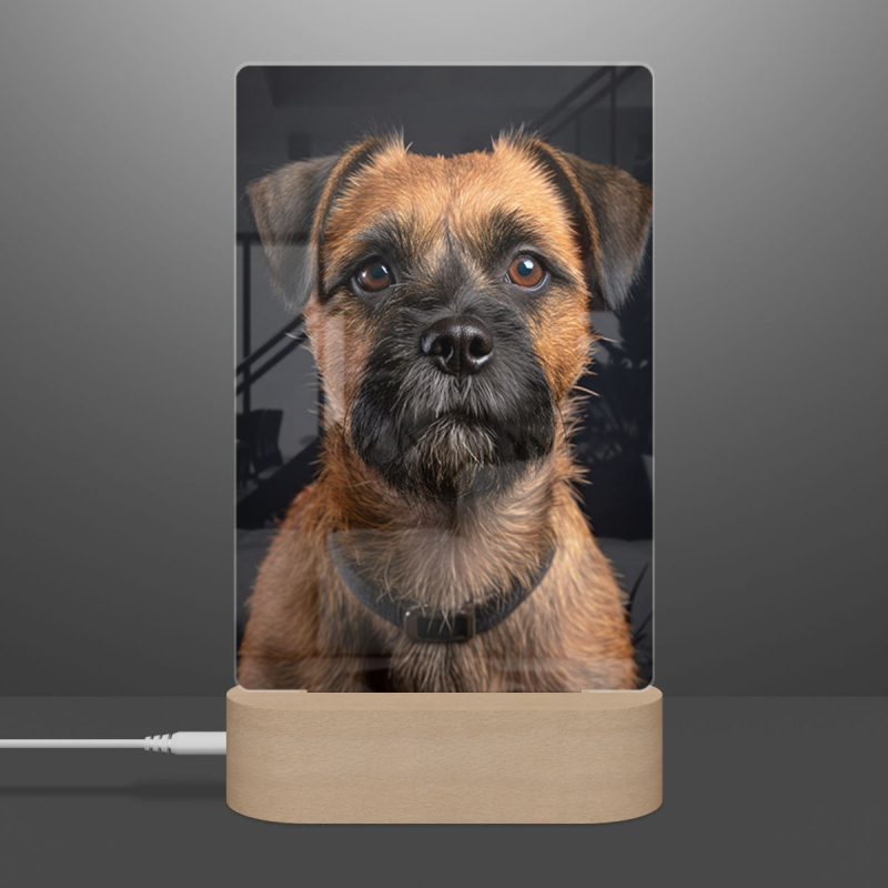 Součástí balení je akrylové sklo dle výběru, dřevěný RGB LED stojánek a napájecí USB kabel.