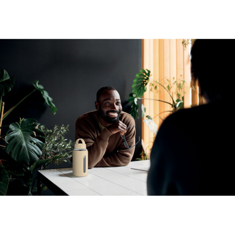 Láhev z borosilikátového skla se silikonovým návlekem a PP víčkem s rukojetí. Objem: 600 ml