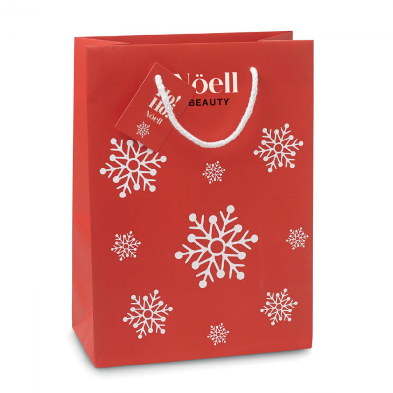 Elegantní papírová dárková taška se vzorem sněhových vloček. Obsahuje jmenovku. Střední velikost.