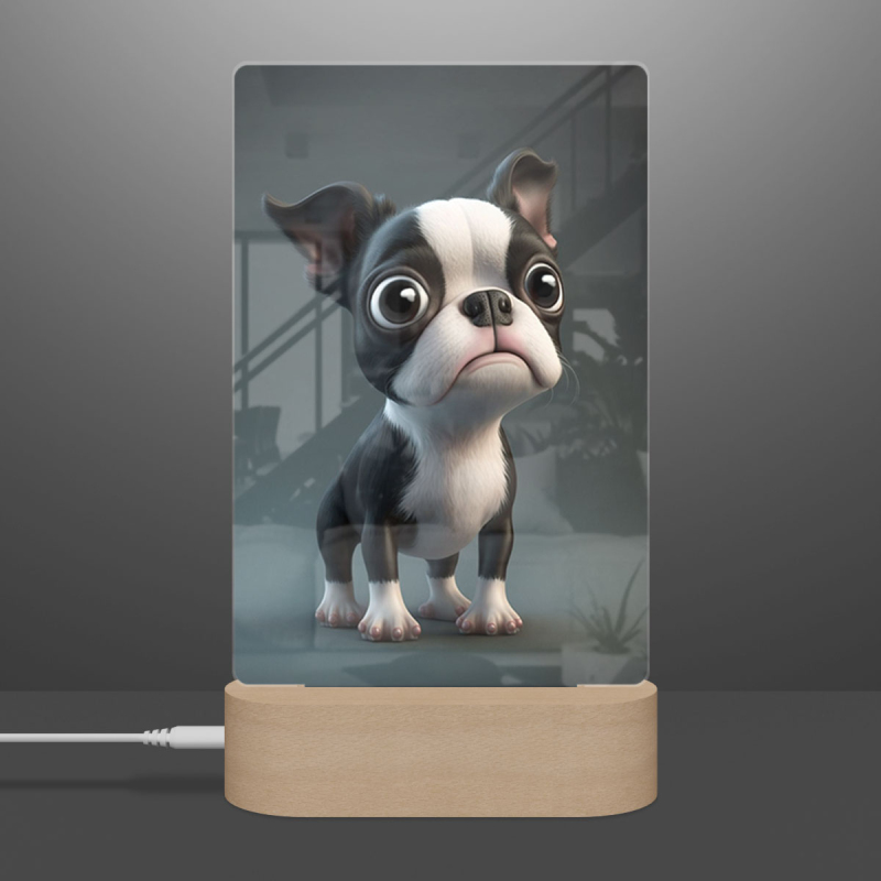 Součástí balení je akrylové sklo dle výběru, dřevěný RGB LED stojánek a napájecí USB kabel.