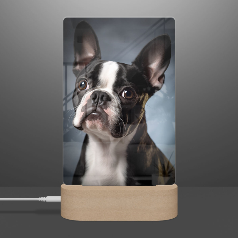Součástí balení je akrylové sklo dle výběru, dřevěný RGB LED stojánek a napájecí USB kabel.