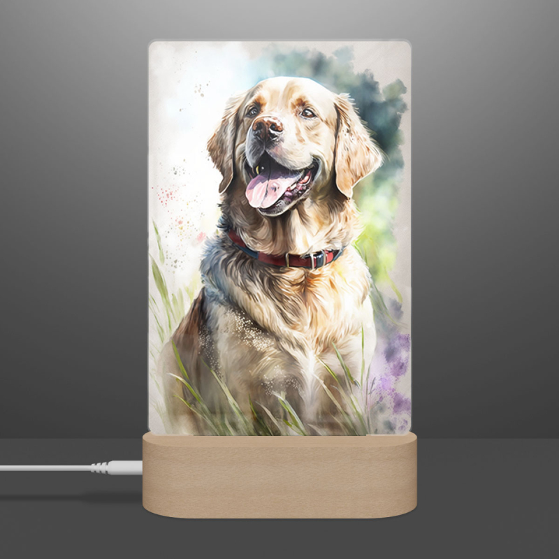 Součástí balení je akrylové sklo dle výběru, dřevěný RGB LED stojánek a napájecí USB kabel.
