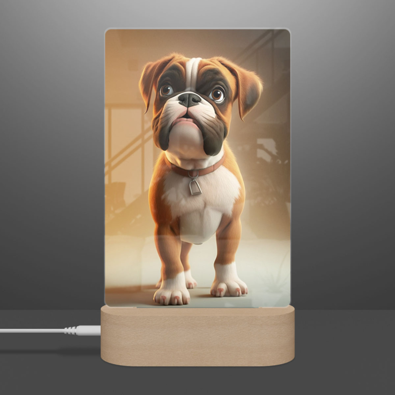 Součástí balení je akrylové sklo dle výběru, dřevěný RGB LED stojánek a napájecí USB kabel.