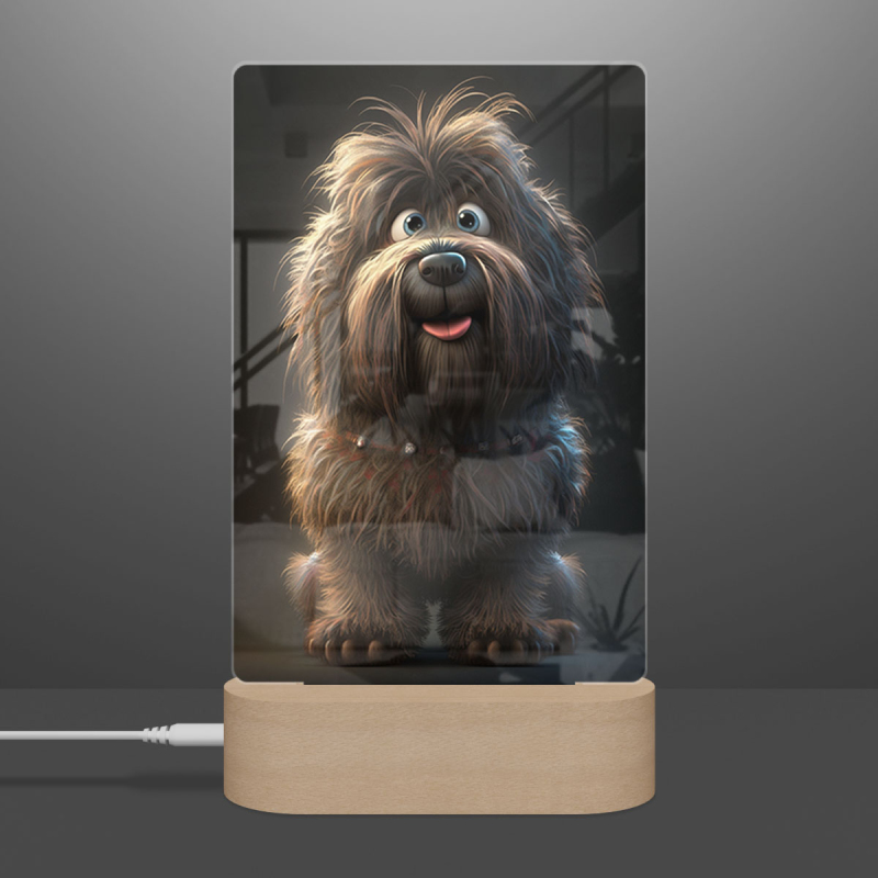 Součástí balení je akrylové sklo dle výběru, dřevěný RGB LED stojánek a napájecí USB kabel.