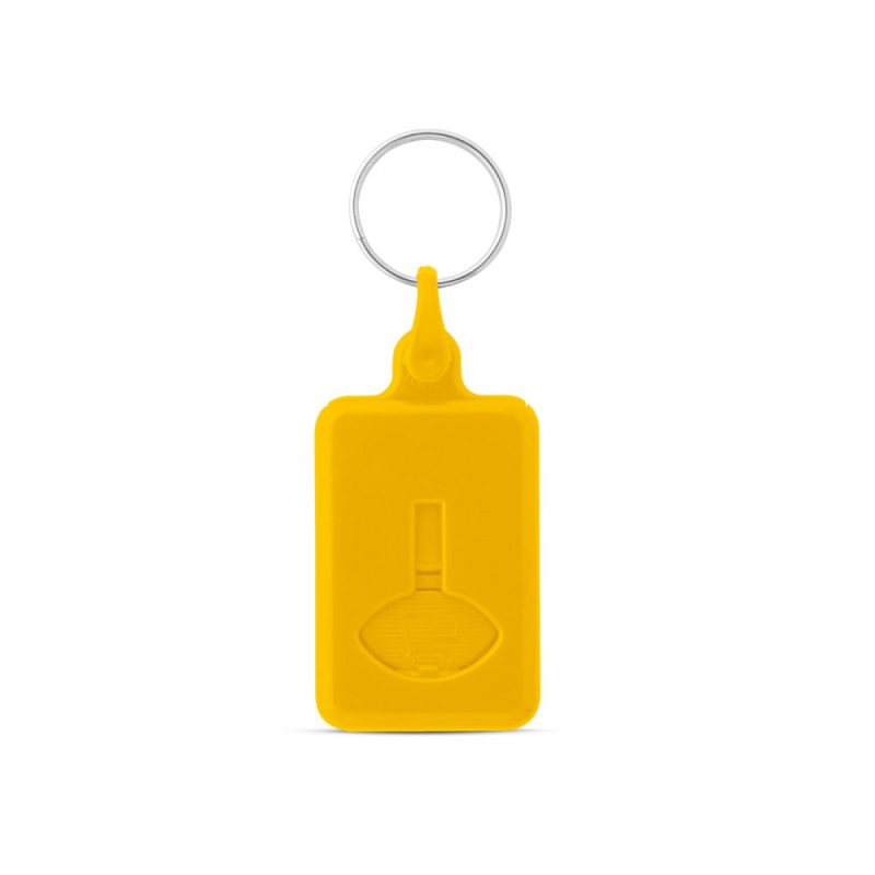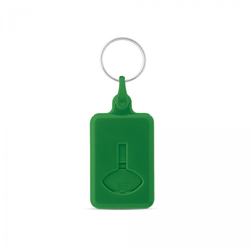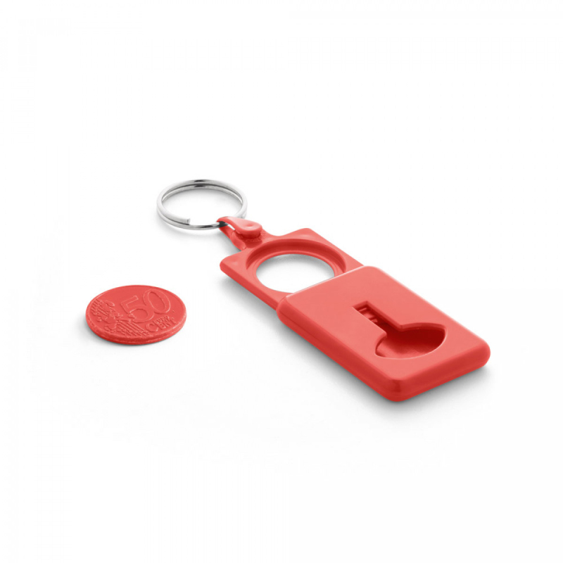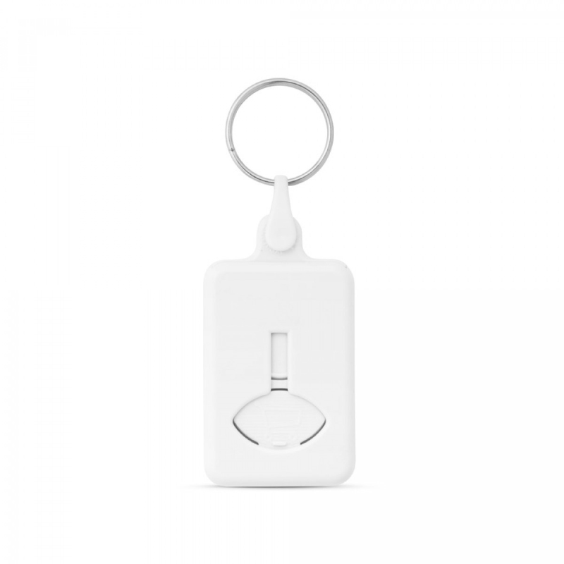 Klíčenka z ABS s mincí do vozíků v supermarketech. 33 x 48 x 6 mm