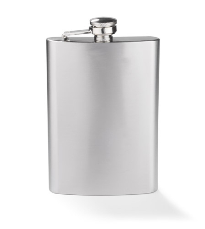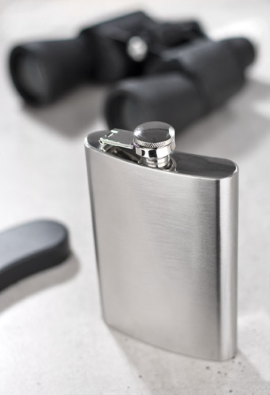 Nerostné ocelové flaška na líh o objemu 240 ml se bezpečným uzávěrem. Logo může být vyryto na povrchu článku.