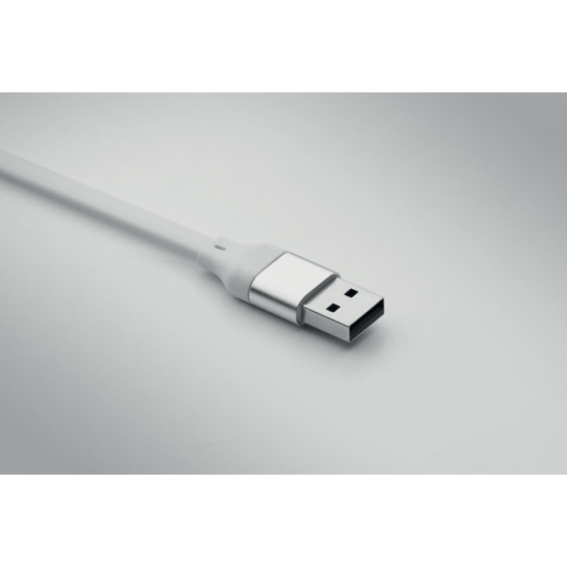 Přívěsek na klíče a nabíjecí 60W kabel s funkcí stojánku na telefon. Kryt z recyklovaného ABS. Vstup: 2v1 Type-C a Type-A. Výstup: Type-C a micro-B (2v1 kolíku). Délka kabelu: 26 cm.