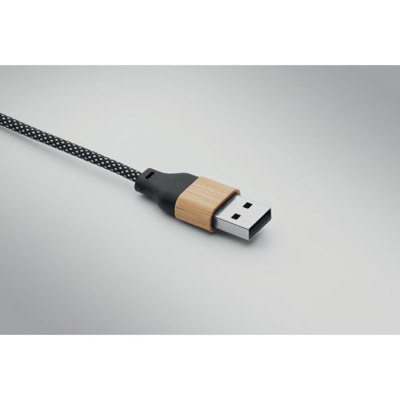 60W nabíjecí kabel z RPET s bambusovými detaily. Vstup: 2v1 Type-C a Type-A. Výstup: Type-C s konektorem 2v1.