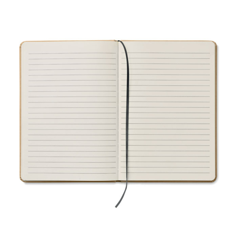 Zápisník A5 s obálkou z tvrdého recyklovaného kartonu. 160 linkovaných stránek (80 listů recyklovaného papíru). Elastický pásek, poutko na pero a záložka. Včetně tlačítkové kuličkového pera s tělem z recyklovaného papíru. Modrý inkoust.