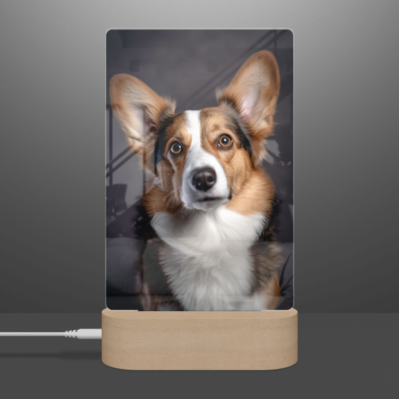 Součástí balení je akrylové sklo dle výběru, dřevěný RGB LED stojánek a napájecí USB kabel.