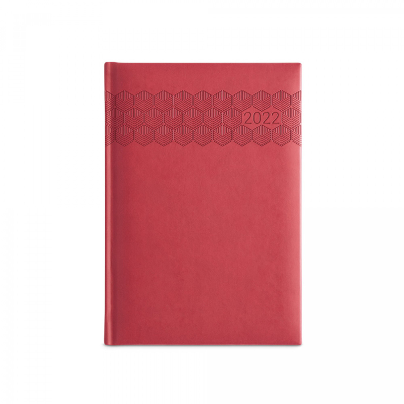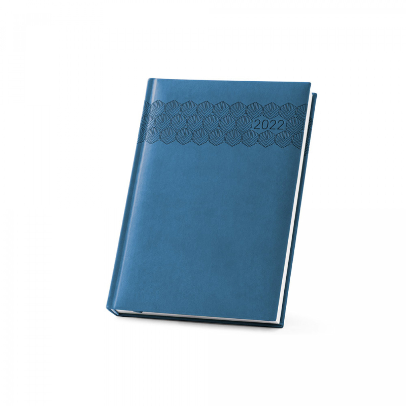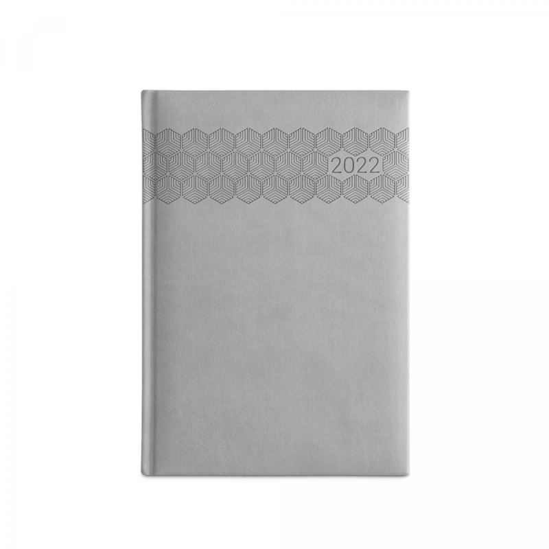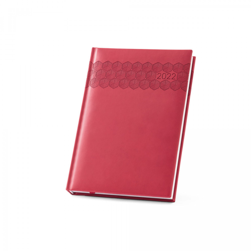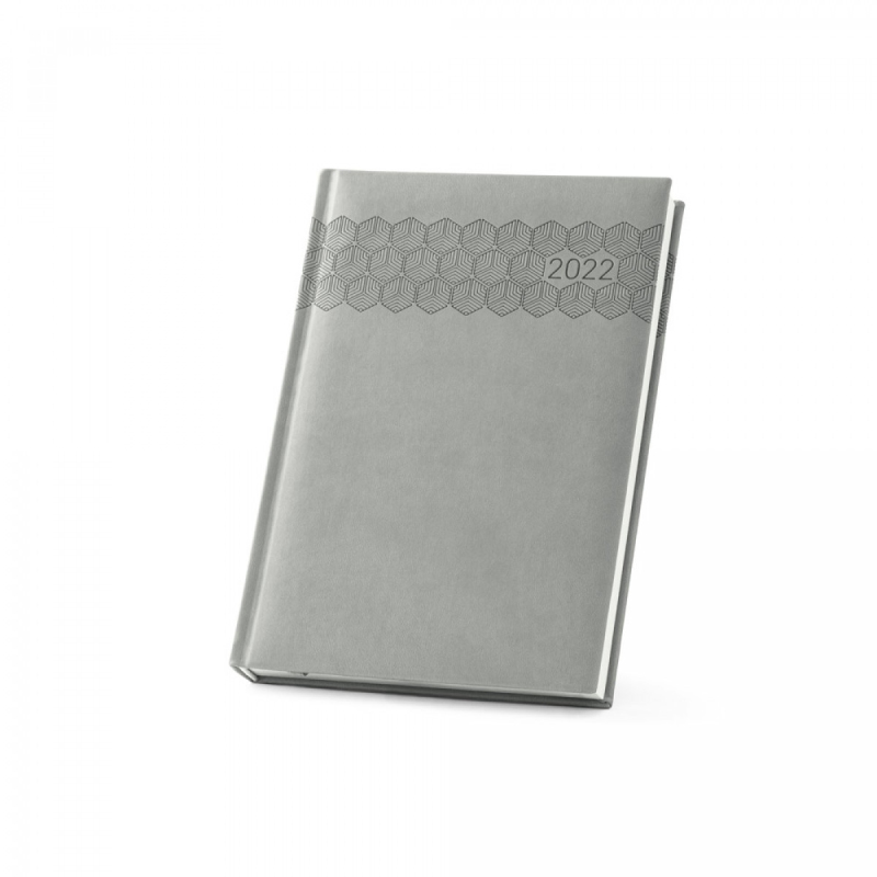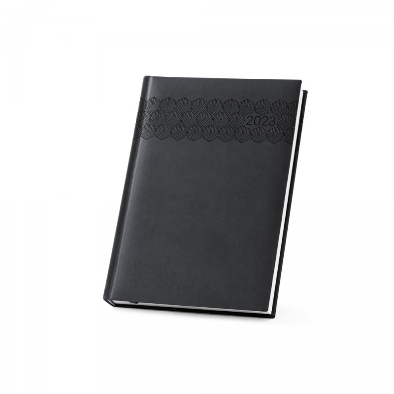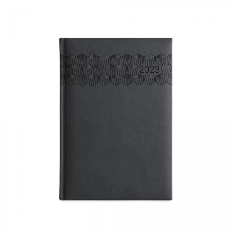 Deník ve formátu A5 z polyuretanu (PU) s potisknutým vzorem a označovačem pomocí stuhy. Je organizovaný do denního plánu. 148 x 210 mm