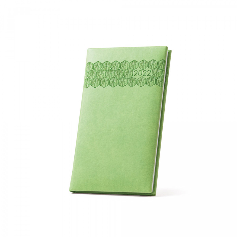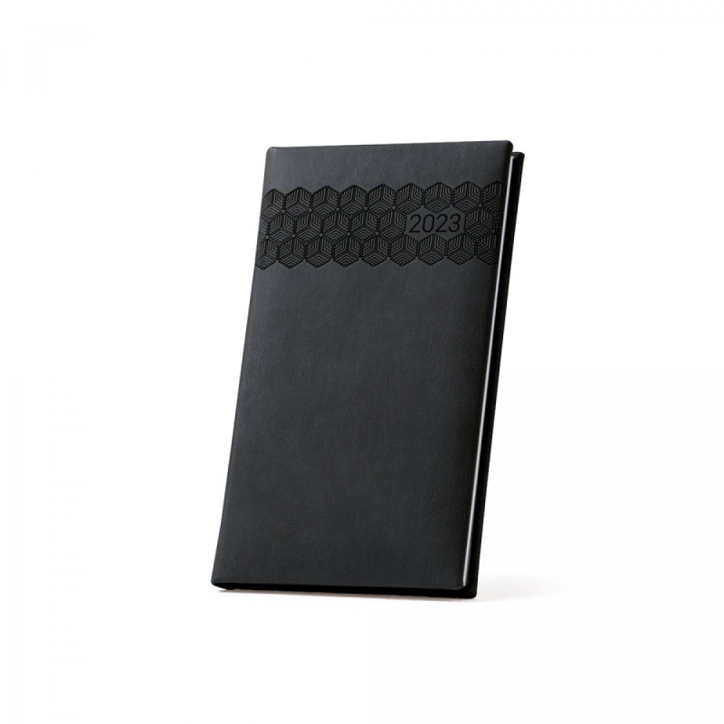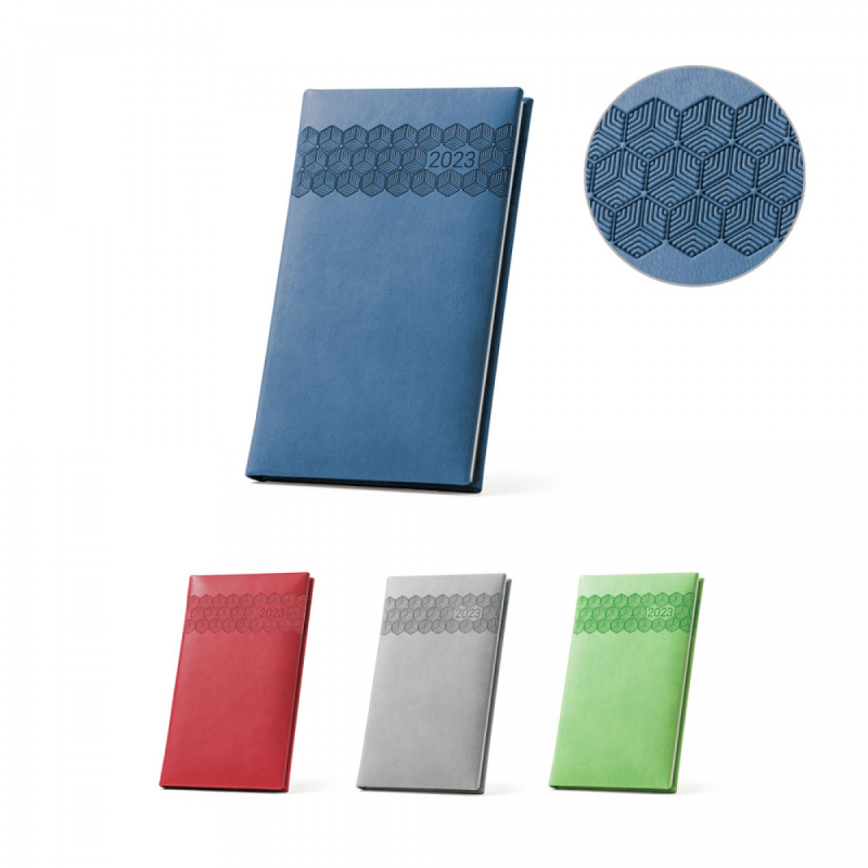 Deník na kapsu z polyuretanu (PU) s potisknutým vzorem a označovačem pomocí stuhy. Je organizovaný v bis týdenním plánu. 85 x 145 mm