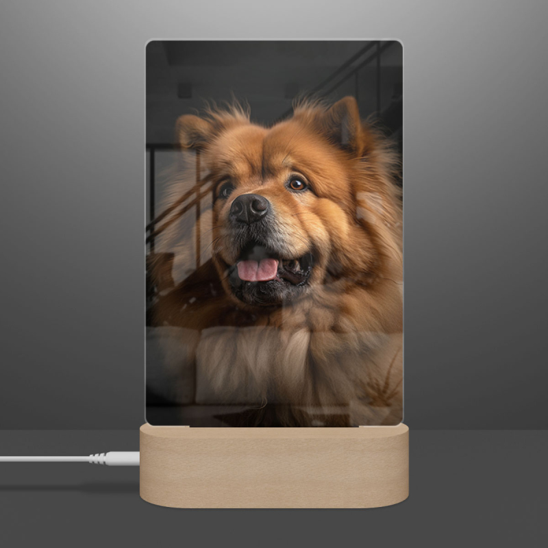 Součástí balení je akrylové sklo dle výběru, dřevěný RGB LED stojánek a napájecí USB kabel.