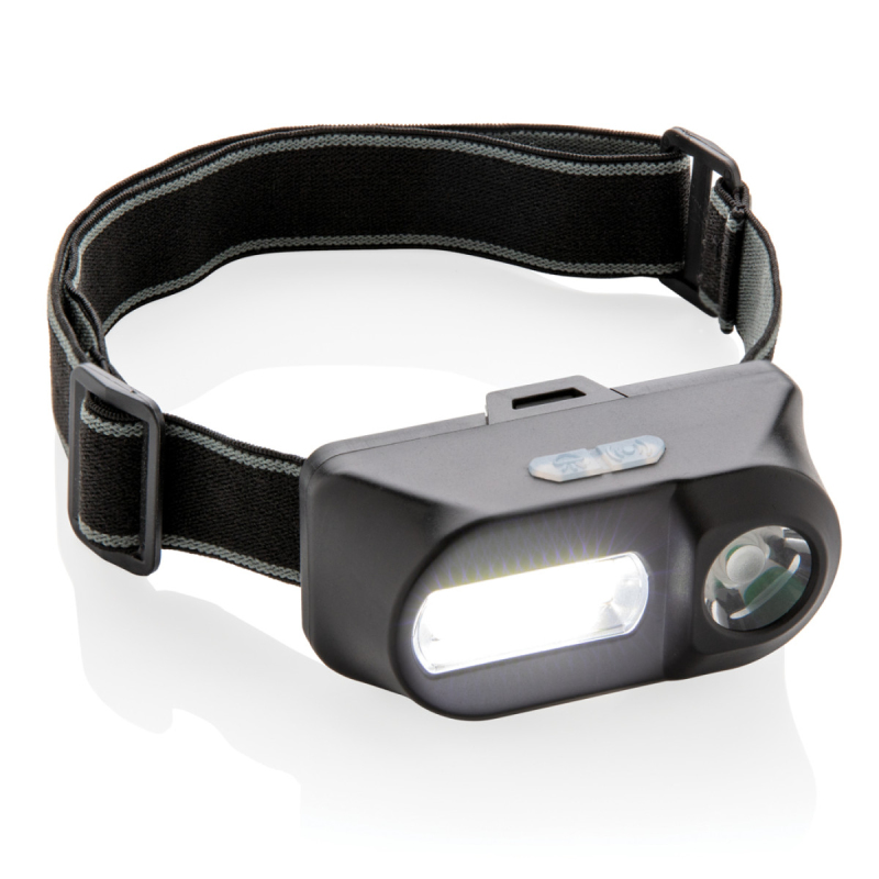 Duální čelovka s LED i COB světlem. COB světlo (180 lumenů) je ideální k osvětlení nedalekých prostor. LED světlo (90 lumenů) je pak ideální na delší vzdálenost (až 80 m). Obě světla mají 3 režimy: silné, slabé, blikající světlo. Přizpůsobitelná elastická (42 cm) čelenka pro nošení na hlavě nebo na helmě. Výdrž až 3 hodiny. Včetně baterií pro přímé použití. Vyrobeno z ABS.