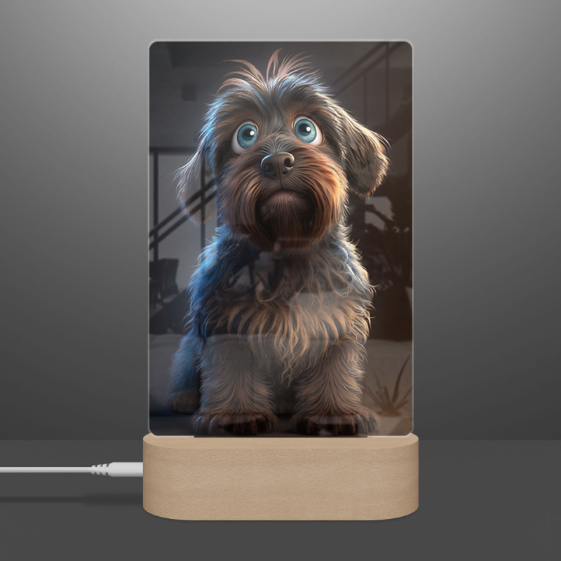 Součástí balení je akrylové sklo dle výběru, dřevěný RGB LED stojánek a napájecí USB kabel.