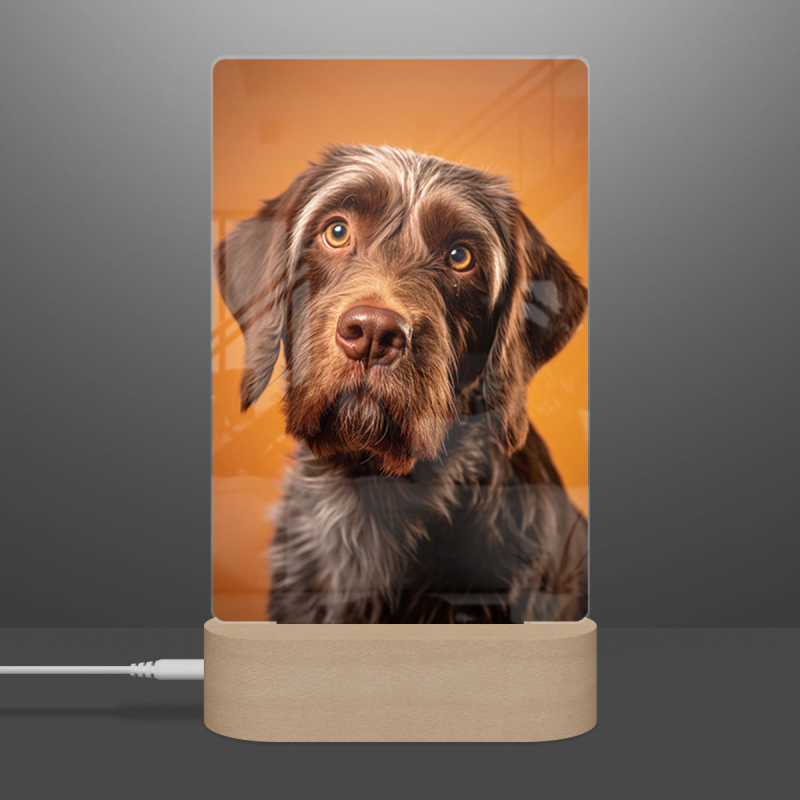 Součástí balení je akrylové sklo dle výběru, dřevěný RGB LED stojánek a napájecí USB kabel.