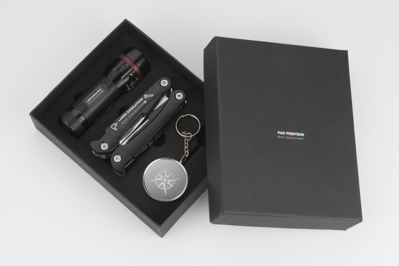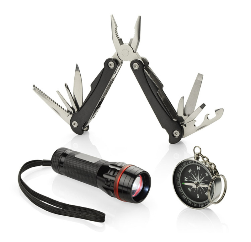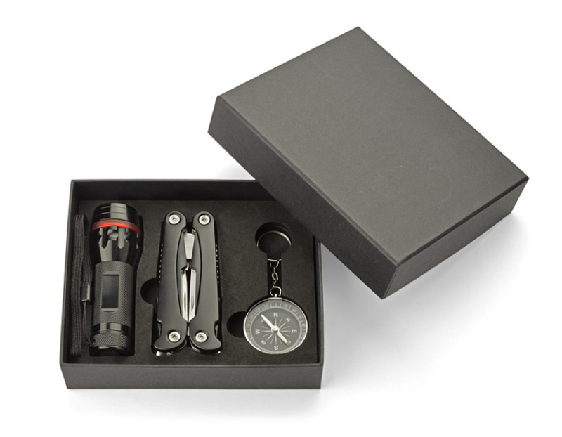 Sada darů zahrnující baterku, multifunkční nástroj a kompas. Baterka má velmi silnou diodu, nastavitelný světelný paprsek (funkce zoomu) a 3 režimy světla: silný, slabý a blikající. Každý prvek je vyroben z kovu a sada je balena v elegantní černé krabičce.