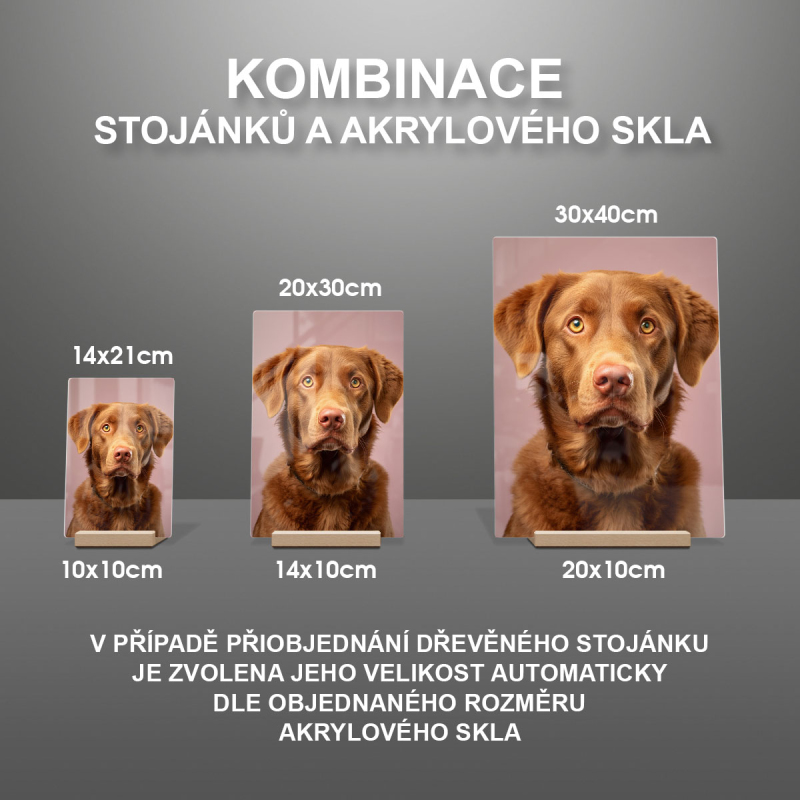 Na produktovém fotu vyobrazena nejoblíbenější varianta akrylového skla 14x21cm a dřevěný stojánek 10x10cm.