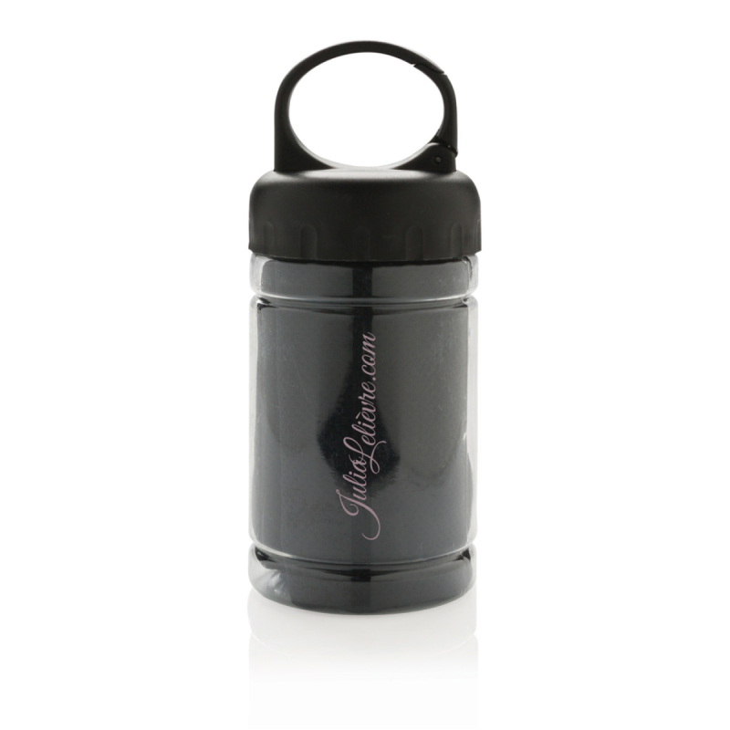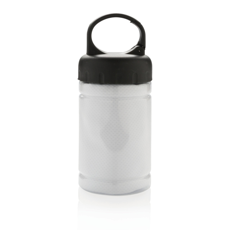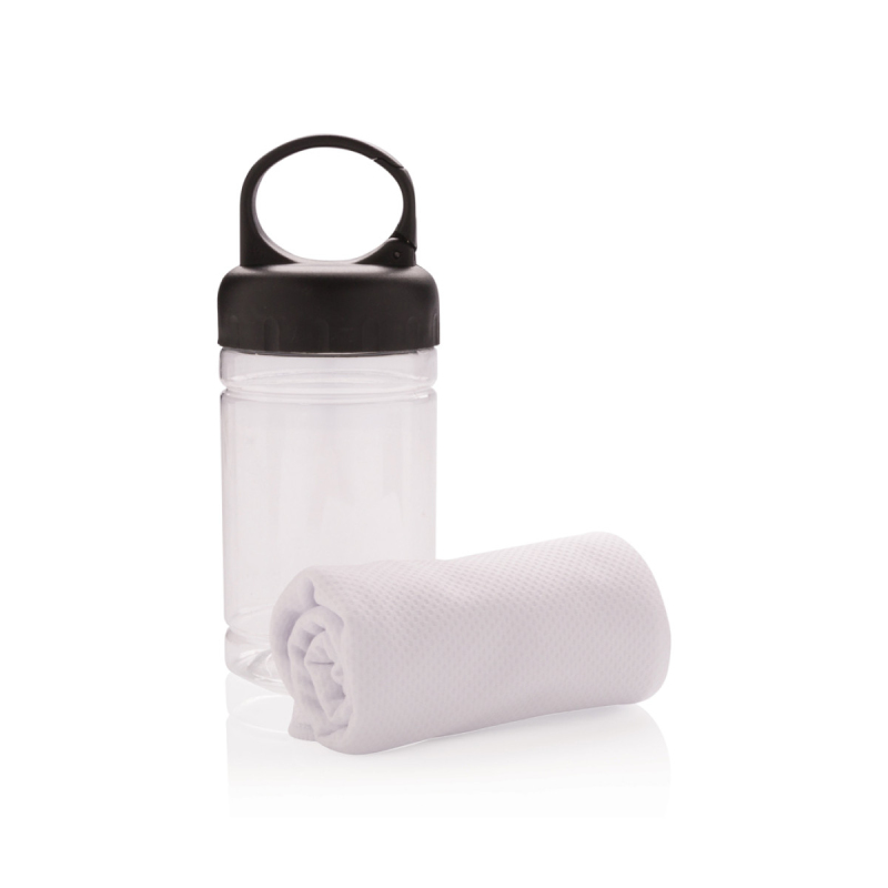 Ručník z mikrovlákna určený k osvěžení při sportu. Jednoduše přidejte studenou vodu do láhve, čímž se ručník ochladí a při použití je příjemně osvěžující. Lahev je vyrobena z PP s víčkem z ABS s karabinou pro upnutí. Funkce blokování až 98 % slunečního záření s UV50+ ochranou. Velikost ručníku: 77 x 30cm.