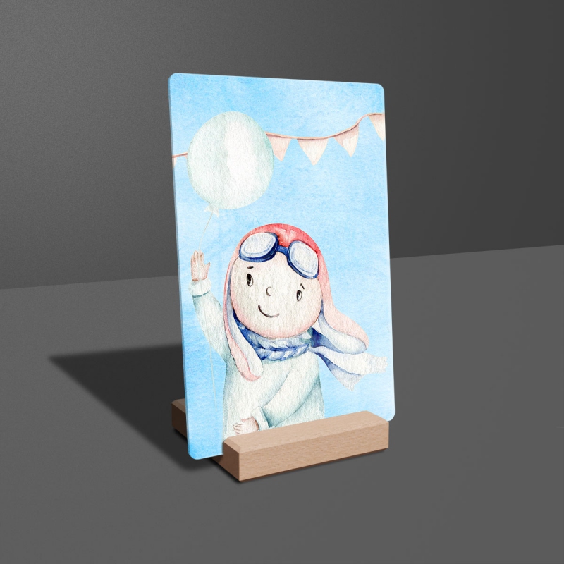 Na produktovém fotu vyobrazena nejoblíbenější varianta akrylového skla 14x21/21x14cm a dřevěný stojánek 10x10cm.