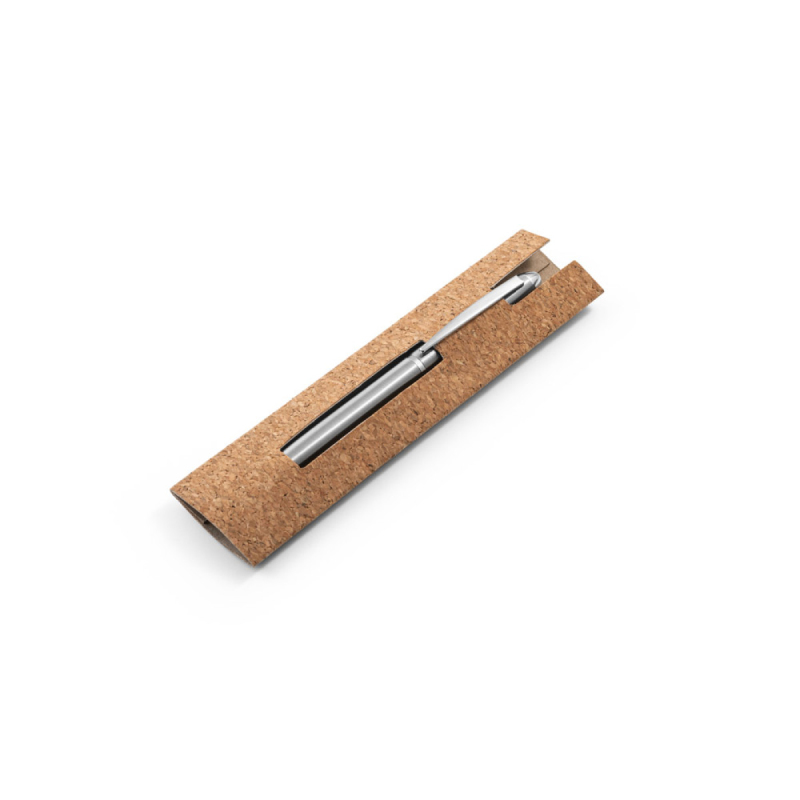 Kuličkové pero s tělem z nerezové oceli (53% recyklace) s klipem. Kuličkové pero má černé písmo a otočný mechanismus. Dodáváno v dárkovém korkovém sáčku. Kuličkové pero: ø11 x 137 mm | Pytlík: 155 x 40 mm