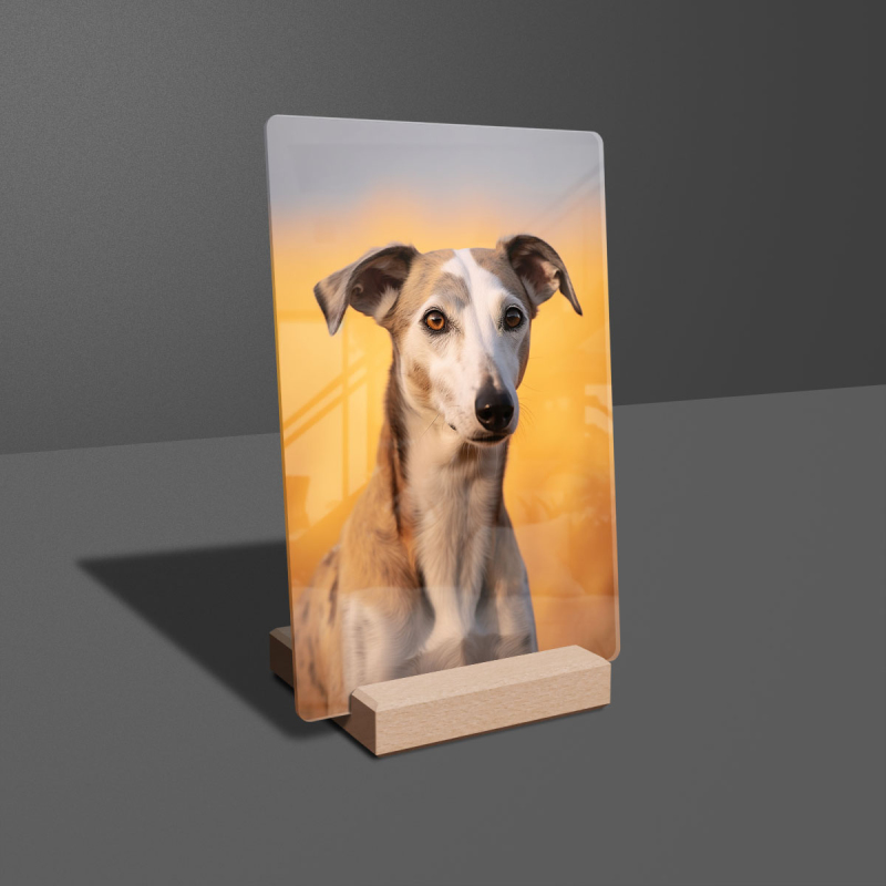 Dárková deska s digitální grafikou psa z akrylového skla.