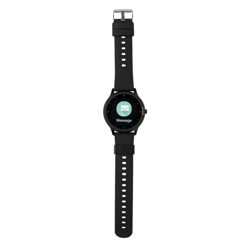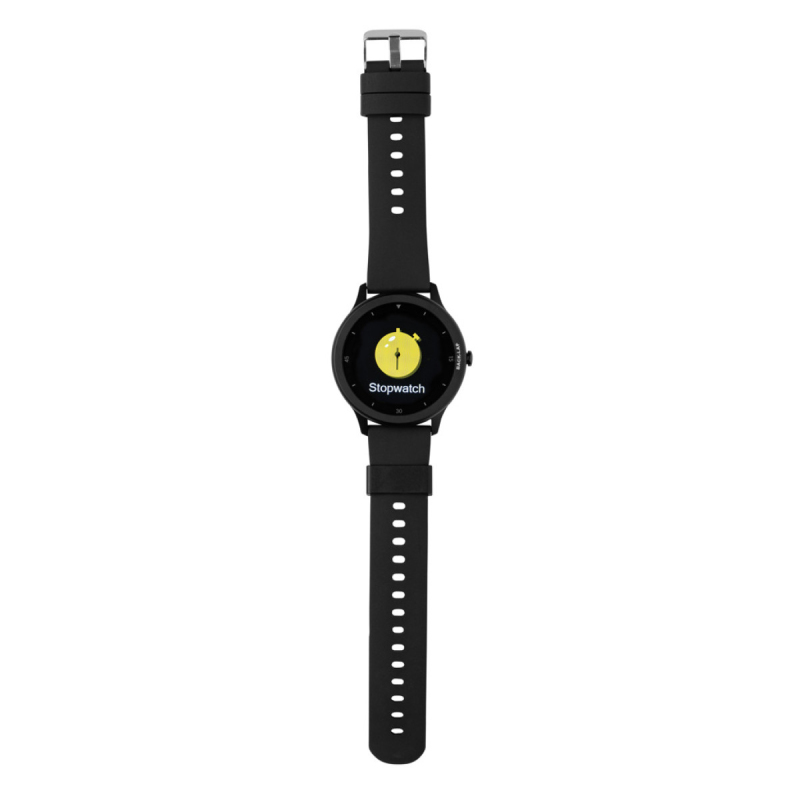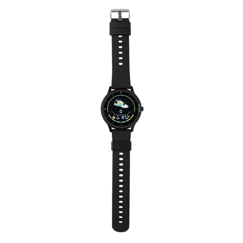 Moderní výkonné hodinky s kulatým 1,28" plně dotykovým displejem s vysokým rozlišením. Vyrobené z RCS recyklovaného TPU (pásek) a kovu (rám hodinek). RCS (Recycled Claim Standard) je globální standard, který umožňuje ověřit použití recyklovaného materiálu v produktu napříč celým dodavatelským řetězcem. Celkový podíl recyklátu dle váhy produktu: 23 %. Funkce zahrnují: sledování spánku, krokoměr, měření vzdálenosti, počítání spálených kalorií, měření srdečního tepu, krevního tlaku, Multi-sport režim (24 sportů), budík, kalendář, notifikace: SMS, Facebook, Skype, WhatsApp a další. Integrovaný mikrofon pro telefonování. Kompatibilní s iOS 8.0 a výše a Android 4.4 a výše skrze BT 5.0. Pohotovostní režim: 15 dnů, pracovní režim: 5 dnů. Voděodolnost IPX68. Včetně nabíječky na klipu. Baleno v FSC® kraftové dárkové krabičce. Produkt i příslušenství bez PVC.