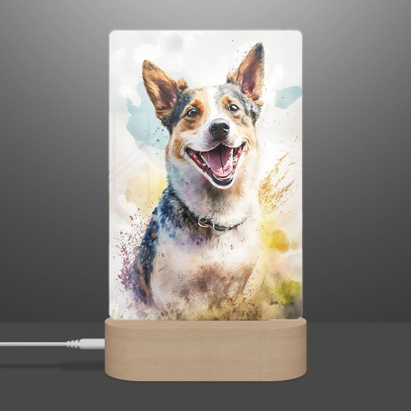 Součástí balení je akrylové sklo dle výběru, dřevěný RGB LED stojánek a napájecí USB kabel.