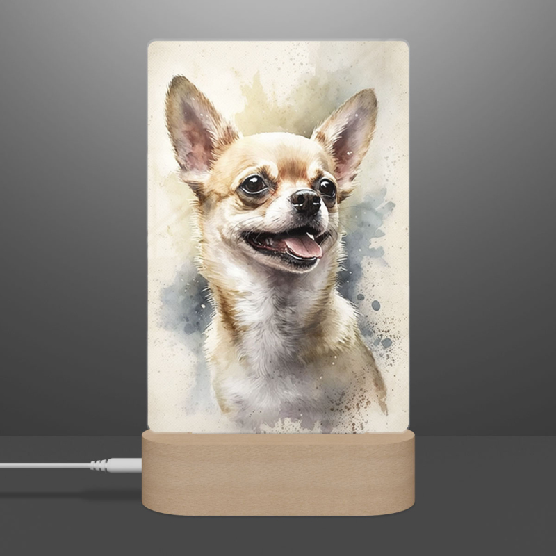Součástí balení je akrylové sklo dle výběru, dřevěný RGB LED stojánek a napájecí USB kabel.