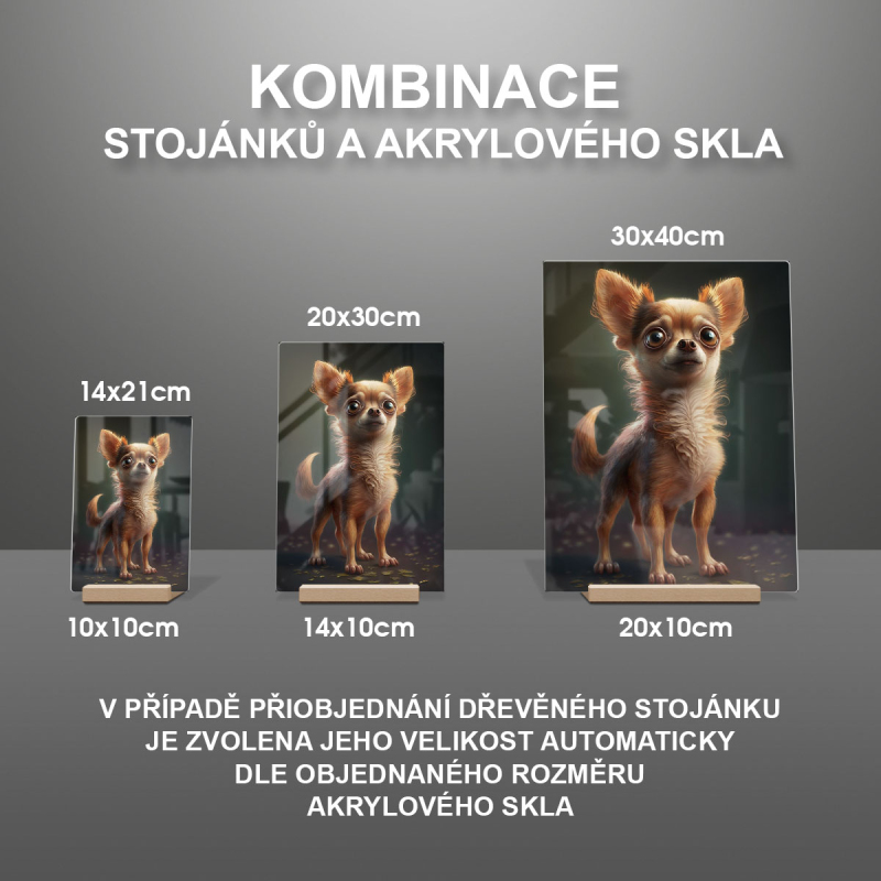 Na produktovém fotu vyobrazena nejoblíbenější varianta akrylového skla 14x21cm a dřevěný stojánek 10x10cm.