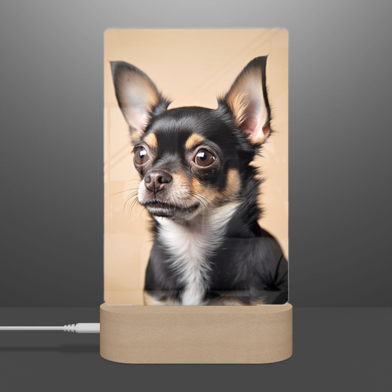 Součástí balení je akrylové sklo dle výběru, dřevěný RGB LED stojánek a napájecí USB kabel.