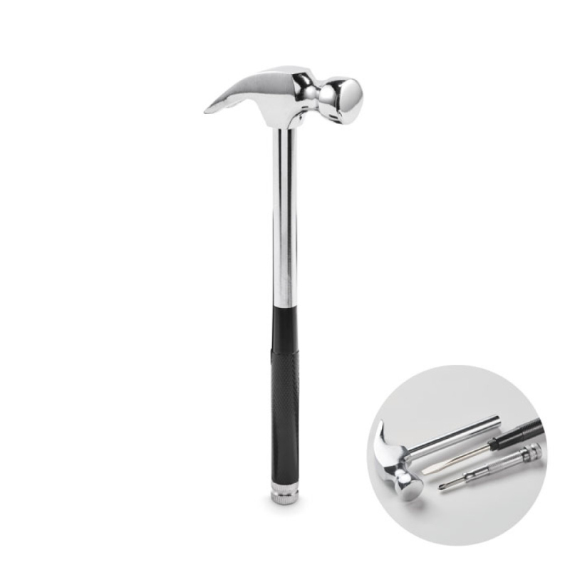Kladivo a šroubovák z uhlíkové oceli. Obsahuje 4 bity integrované v rukojeti.