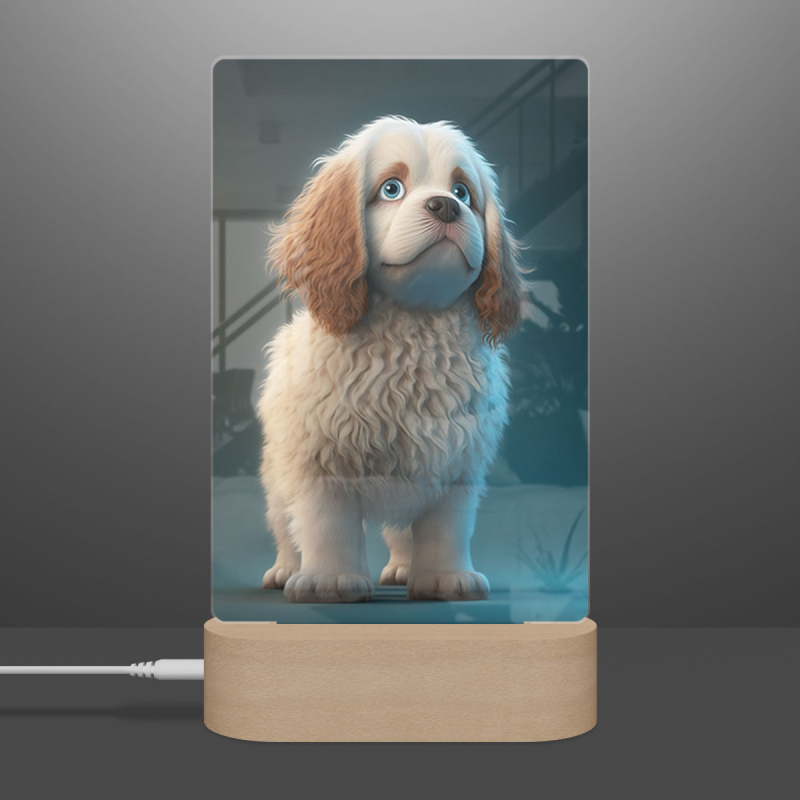 Součástí balení je akrylové sklo dle výběru, dřevěný RGB LED stojánek a napájecí USB kabel.
