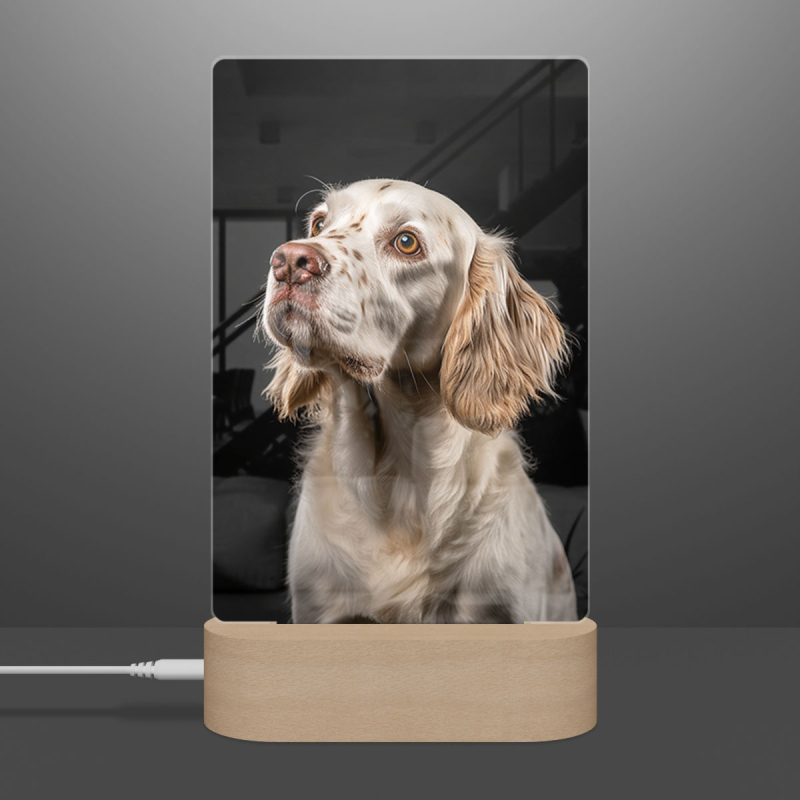 Součástí balení je akrylové sklo dle výběru, dřevěný RGB LED stojánek a napájecí USB kabel.