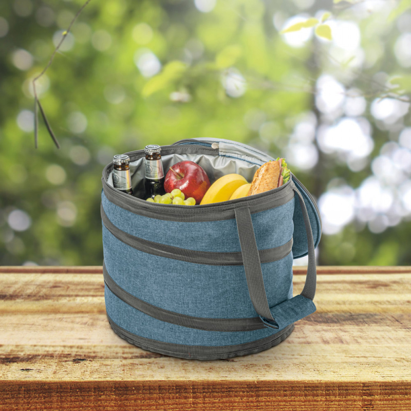 Skládací chladící taška 600D s dvojitým zipem a vnitřkem podšitým PEVA. Vrchní kapsa na zip a popruhy s výztuží. Zahrnuje otvírák na lahve. Chladící taška s kapacitou až 15 litrů. ø300 x 260 mm