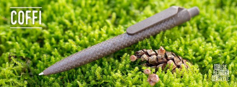 Propiska s 30% podílem kávové sedliny a 70% ABS plastu, v designovém provedení s šupinovým povrchem a velkým klipem určeným na tisk. Kolekce SAVE THE NATURE.