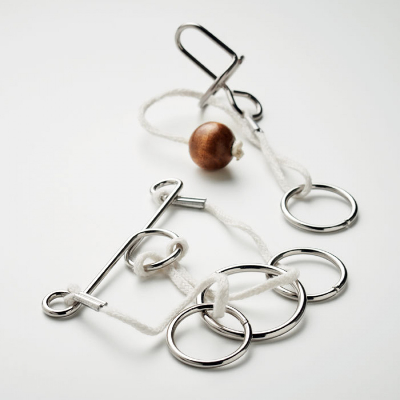 Sada 2 kovových, dřevěných a bavlněných hlavolamů: 2, resp. 4 kusy. Dodáváno v krabičce z recyklovaného papíru.