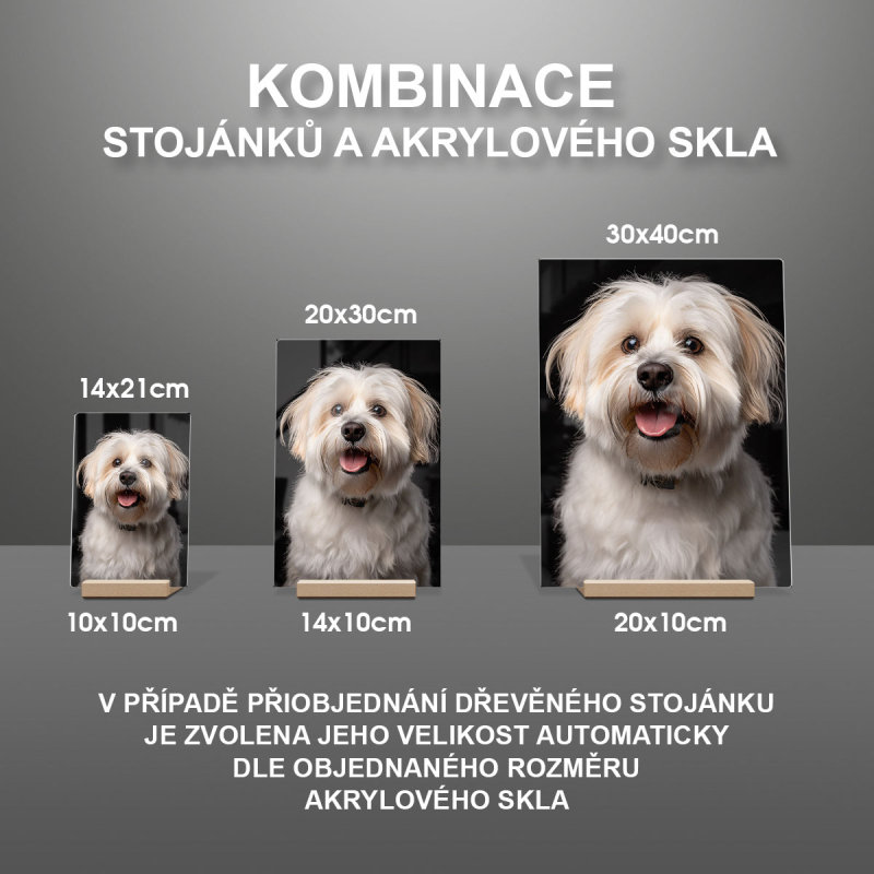 V případě přiobjednání dřevěného stojánku je zvolena jeho velikost automaticky dle objednaného rozměru akrylového skla viz produktové foto.