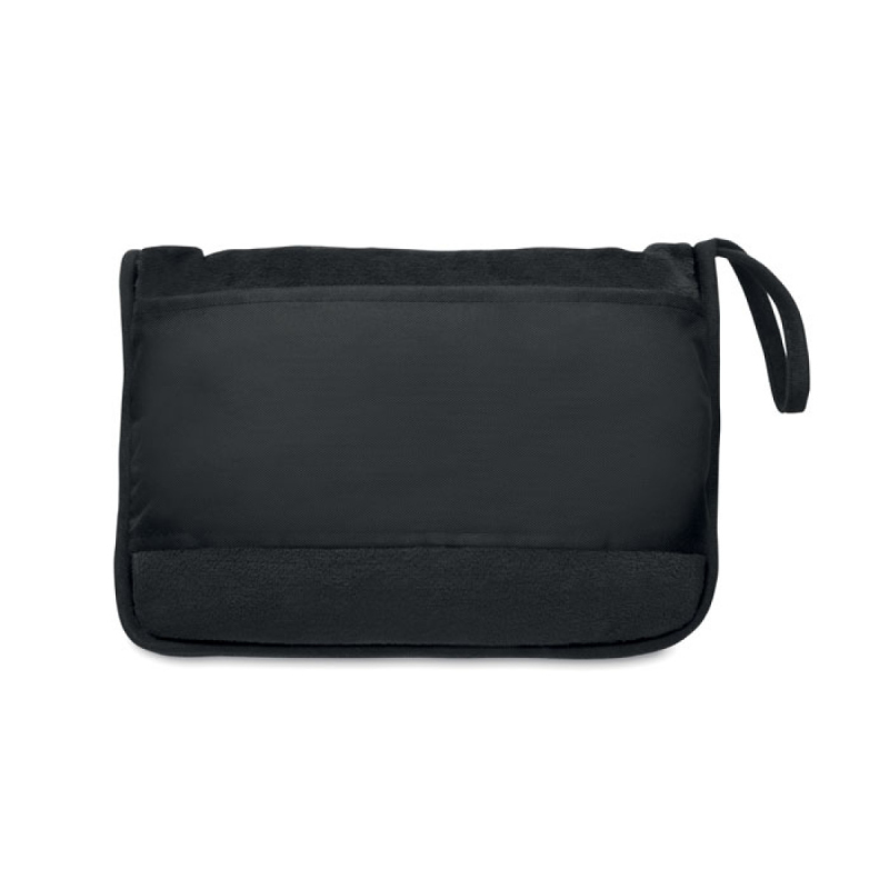 Cestovní flanelová 220g přikrývka a/nebo polštář 2v1. Předmět lze složit. Včetně ramenního popruhu a rukojeti z polyesteru 600D RPET.