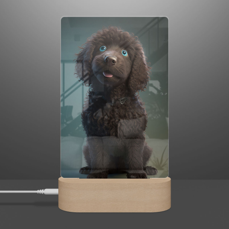 Součástí balení je akrylové sklo dle výběru, dřevěný RGB LED stojánek a napájecí USB kabel.