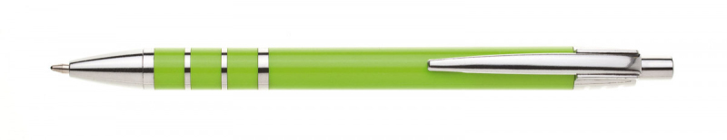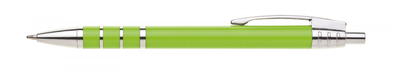 Plastová propisovací tužka SILVI světle zelená. Je zdobena dvěma slabšími a jedním silnějším stříbrným proužkem. Náplň tužky je X20, modře píšící.