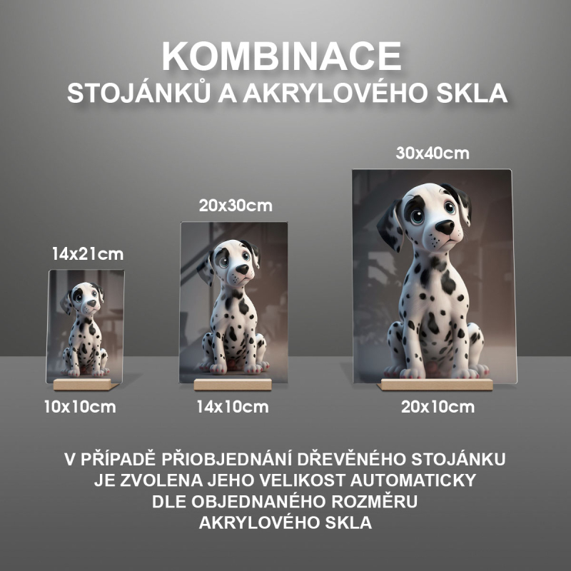 Na produktovém fotu vyobrazena nejoblíbenější varianta akrylového skla 14x21cm a dřevěný stojánek 10x10cm.