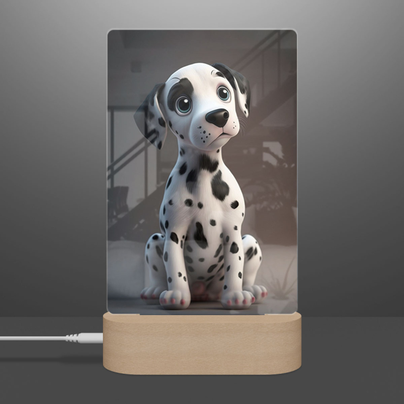 Součástí balení je akrylové sklo dle výběru, dřevěný RGB LED stojánek a napájecí USB kabel.