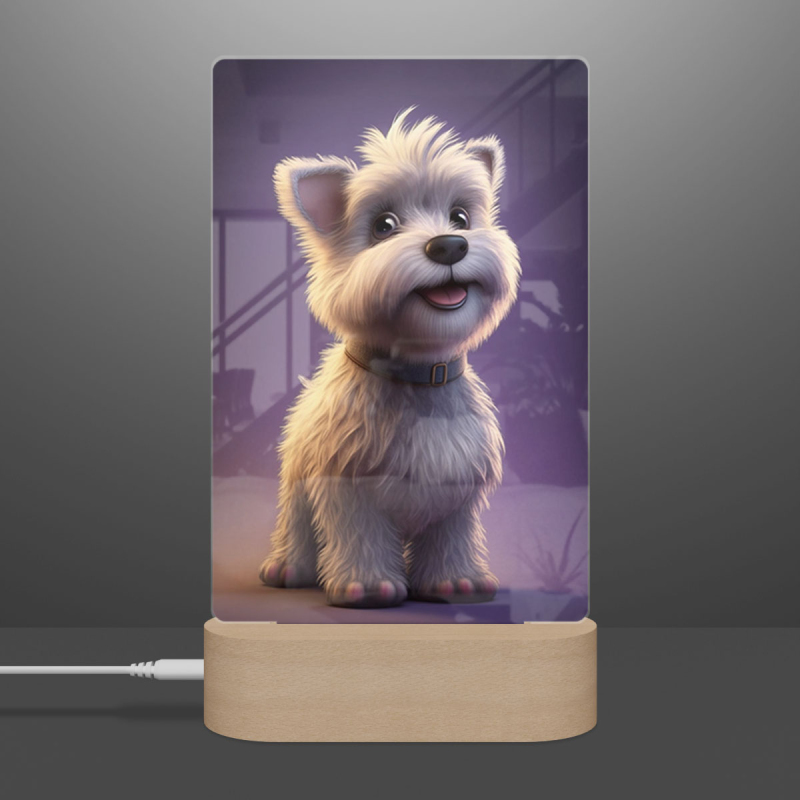 Součástí balení je akrylové sklo dle výběru, dřevěný RGB LED stojánek a napájecí USB kabel.