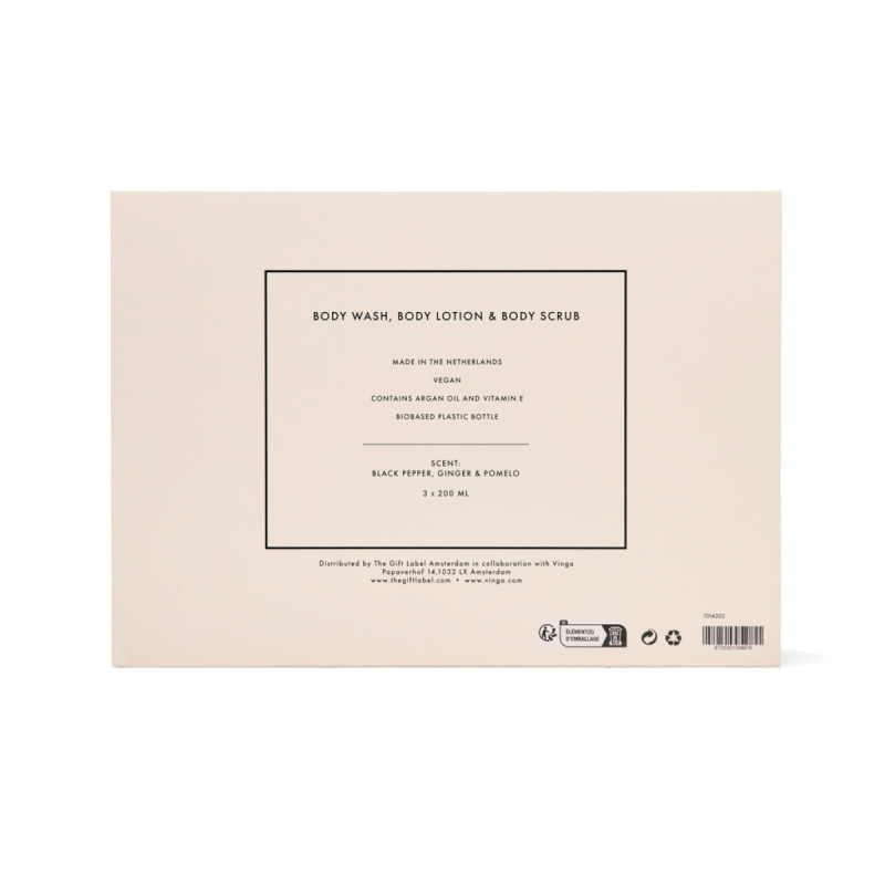 Proměňte každou sprchu či koupel v luxusní rituál. Tato sada obsahuje tři 200ml tuby – sprchový gel, tělový peeling a tělové mléko – pečlivě navržené tak, aby vyživovaly vaši pokožku od hlavy až k patě. Díky teplé a svěží vůni černého pepře, zázvoru a pomela zanechá vaši pokožku hebkou, osvěženou a jemně provoněnou. Elegantně zabaleno v dárkové krabičce v krémově bílé a černé barvě.
