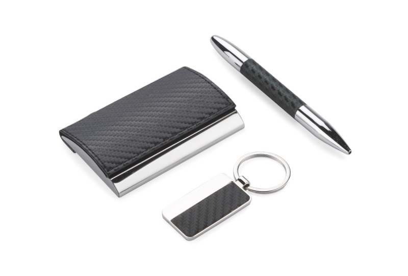Soubor elegantního daru, který zahrnuje držák na vizitky, klíčenku a pero. Vše zabaleno v černé krabici. Logo může být vyryto na klíčence nebo držáku na vizitky.