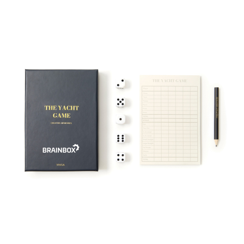 Full house, postupka nebo yatzy? Jedná se o hru s pěti kostkami ve stylové krabičce se zlatým potiskem. Díky krásné krabičce ji můžete darovat nebo použít jako pěkný detail na konferenčním stolku. Pozn.: název hry změněn z Yatzy na Yacht. Skladové zásoby jsou postupně nahrazovány novou variantou.